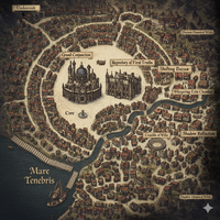 Darlington is like a a dream-city where architecture and environment are somewhat fluid but follows inherent rules. Buildings might lean at impossible angles, streets might lead to entirely different districts than expected at times, and the sky could change color based on the general mood of world. The City is often beautiful in an unsettling, melancholic way, with pockets of stark horror and mirthful glee. There are glimpses of familiar Waterdeep landmarks, but always twisted, slightly off-kilter, and echoing with unseen memories. The City isn't a flat spread but has spiraling towers, deep chasms, flooded districts, and high, precarious rooftops, almost as if it's reflecting someone's mind.