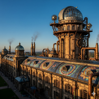 Well known to be the functional core of the City, the Grand Conjunction ties it all together. From the outside, the structure resembles an intricate observatory with a colossal clock tower, a testament to steampunk ingenuity. The towering edifice has riveted iron and aged brass, its surface adorned with intricate gears and spiraling pipes. Large, arched windows offer glimpses into the inner workings of the machine, while the warm glow of internal lights spills out, casting long shadows. The observational tower has a rotating array of lenses and focusing crystals at the top, subtly shifting and adjusting, suggesting the complex calculations happening within.