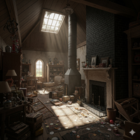 The interior spaces are defined by silence and unsettling auditory hallucinations. Faint, ghostly murmurs drift on unseen currents—fragments of conversations from a different world, half-remembered fears, or indistinct whispers that promise dark secrets. These auditory ghosts adhere to the walls and echo through the empty rooms, ensuring that no internal thought or external phrase is ever truly forgotten. Scattered amongst the detritus and broken furniture are glittering discarded, shiny trinkets—objects and sounds that caught someone's attention for a moment before being tossed aside. The very air seems to hold a record of communication and noise.